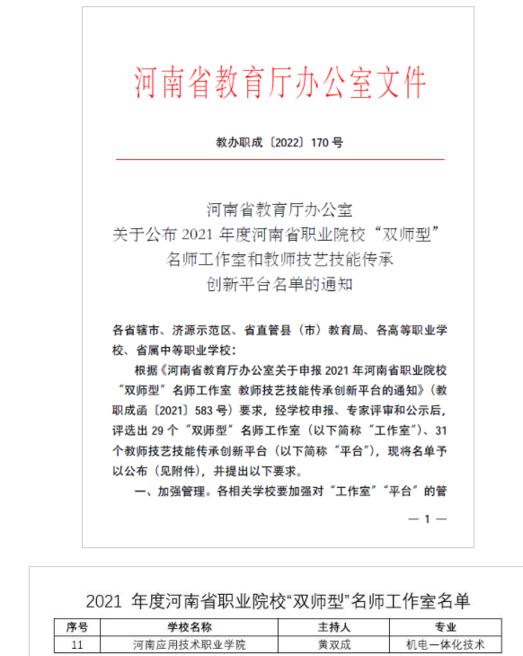 5月24日,河南省教育厅发布了《河南省教育厅办公室关于公布2021年度河南省职业院校“双师型”名师工作室和教师技艺技能传承创新平台名单的通知》(教办职成〔2022〕170号)文件,公布了2021年河南省职业院校“双师型”名师工作室和教师技艺技能传承创新平台名单,我院黄双成为主持人的机电一体化技术专业“双师型”名师工作室获得立项建设。