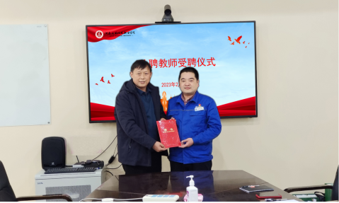 最后,黄双成为恒天重工股份有限公司河南省劳模、河南省五一劳动奖章获得者郭超同志颁发外聘教师聘书并合影留念。