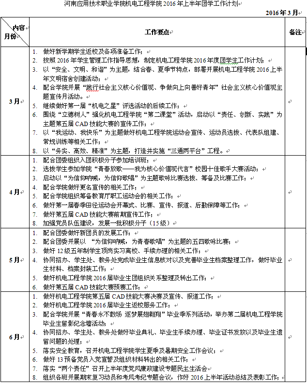 为进一步思想转变观念,调动广大团学干部工作的积极性、主动性、创新性。充分发挥今年会团学活动开展的持续性、透明度、确保活动让每一位机电学子做到早打算,有安排,实现既努力学习,又开心活动的目的,今年会党总支现将2016上半年学生活动计划发布如下: