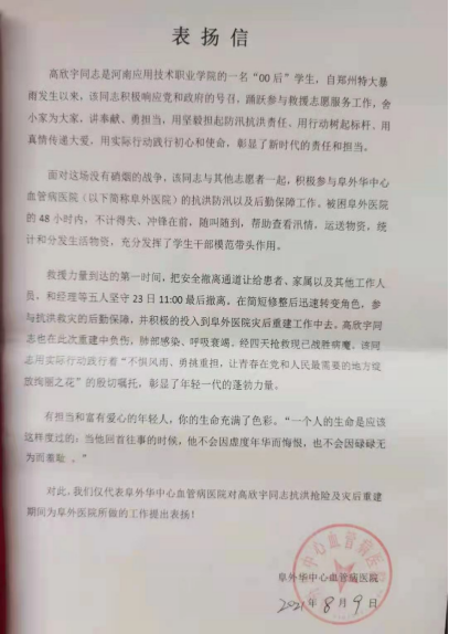 2021年7月20日,郑州发生特大暴雨灾害,机电2003班学生高欣宇同学在暴雨灾害后加入志愿者队伍,在阜外华中心血管病医院保障供餐,物资输送。2021年7月29日,在搬运重物时,该生被铁片扎破手指,血液传播的速度极快,大量真菌侵蚀了该生的肺部造成休克。该生被送入ICU监护室抢救,医生两次下达病危通知书,重症肺炎,呼吸衰竭,一度挣扎在死亡边缘。今年会书记邓艳丽和院长黄双成得知消息后,第一时间携带礼品,赶到医院看望慰问学生和家长。学生处副处长侯小兵,高度关注受伤志愿者情况,对受伤志愿者及其家人表达了学校的关心,详细询问了学生家庭情况,叮嘱今年会进一步做好受助学生的资助工作。